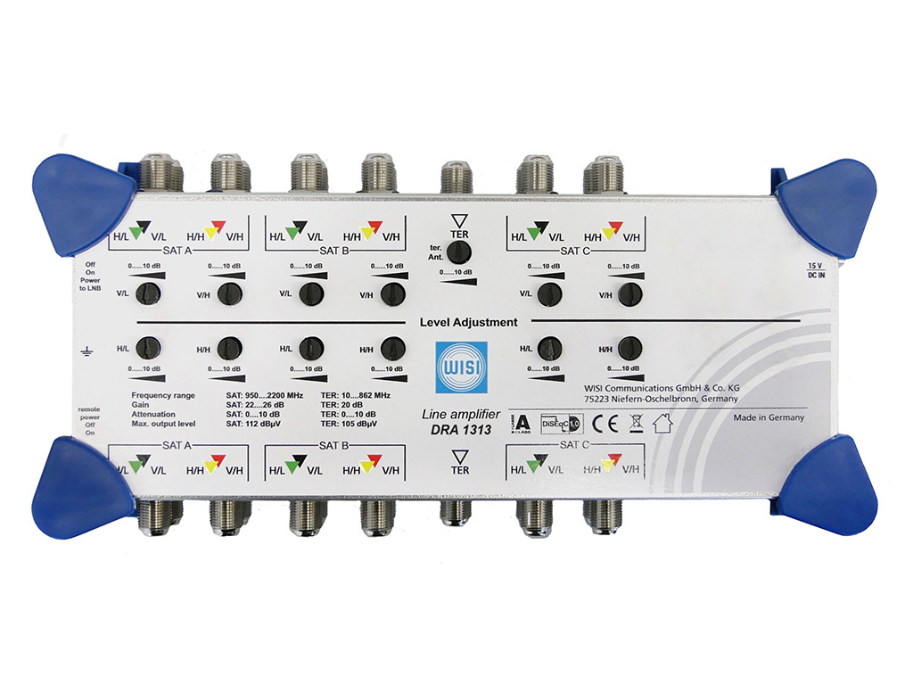 Der DRA 1313 ist ein Verstärker für die 12 Polarisationsebenen von drei Satelliten und terrestrischer Signale. Mit einer Verstärkung von 26 dB ist dieser optimal für die Nutzung als Linienverstärker in Multischalterkaskaden geeignet. Die Verstärkung kann individuell je Eingang um bis zu 10 dB verringert werden, um auch Pegelunterschiede zwischen den einzelnen Polarisationsebenen auszugleichen. Die Versorgungsspannung kann sowohl lokal, durch das optionale Netzteil DRP 1533 oder mit einer Fernspeisung über die Stammleitungen realisiert werden.