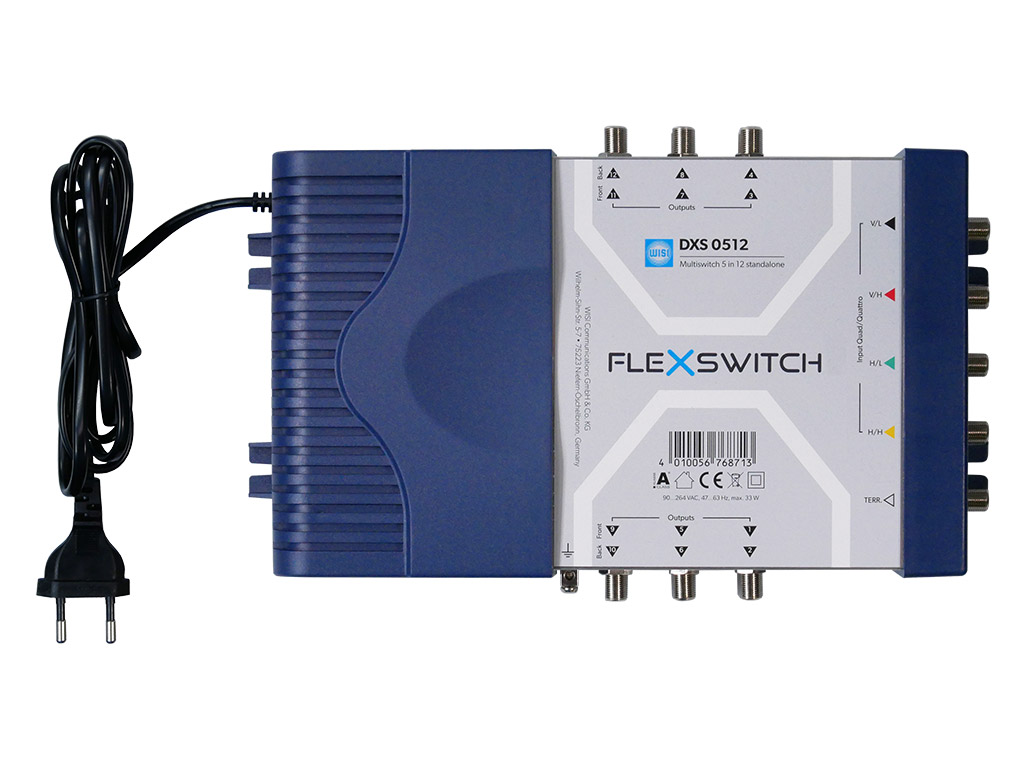 Der DXS 0512 ist ein stand-alone Multischalter mit 5 Eingängen zur Verteilung von 4 Satelliten Polarisationsebenen und terrestrischer Signale. Das stand-alone Gerät ist mit einem integrierten Netzteil ausgestattet welches die LNBSpannungsversorgung sicherstellt. Zusätzlich ist ein 22 KHz Generator integriert welcher, neben QUATTRO, auch die Nutzung von QUAD-LNBs ermöglicht. An den 12 Teilnehmerausgängen können handelsübliche DVB-S/S2 Receiver oder TV-Geräte mit integriertem Empfänger betrieben werden. Eingespeiste terrestrische Signale wie DVB-T/T2, DAB oder UKW stehen ebenfalls an jedem Teilnehmerausgang zur Verfügung. Der DXS 0512 überzeugt mit einer niedrigen Anschlussdämpfung die durch den aktiven terrestrischen und SAT- Zweig realisiert wird.