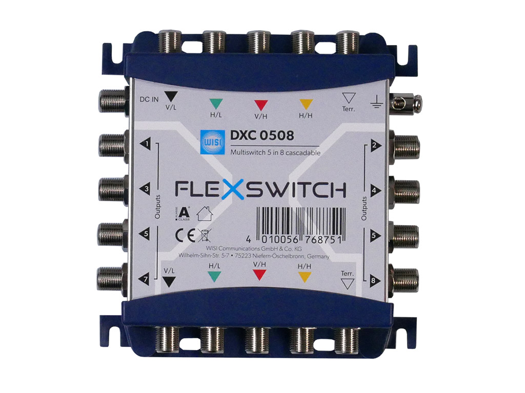 Der DXC 0508 ist ein Kaskaden-Multischalter mit 5 Eingängen zur Verteilung von 4 Satelliten Polarisationsebenen und terrestrischer Signale. Die Ebenen stehen an 5 Kaskadenausgängen für nachfolgende Multischalter zur Verfügung. An den 8 Teilnehmerausgängen können handelsübliche DVB-S/S2 Receiver oder TV-Geräte mit integriertem Empfänger betrieben werden. Eingespeiste terrestrische Signale wie DVB-T/T2, DAB oder UKW stehen ebenfalls an jedem Teilnehmerausgang zur Verfügung. Der DXC 0508 überzeugt mit einer niedrigen Anschlussdämpfung die durch den aktiven terrestrischen und SAT- Zweig realisiert wird. Die LNB- Spannungsversorgung wird über die Stammleitungen oder über die optional erhältlichen externen Netzteilen DXP 1812 oder DXP 1830 sichergestellt.