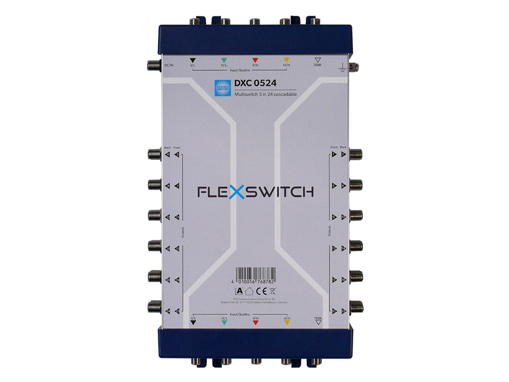 Der DXC 0524 ist ein Kaskaden-Multischalter mit 5 Eingängen zur Verteilung von 4 Satelliten Polarisationsebenen und terrestrischer Signale. Die Ebenen stehen an 5 Kaskadenausgängen für nachfolgende Multischalter zur Verfügung. An den 24 Teilnehmerausgängen können handelsübliche DVB-S/S2 Receiver oder TV-Geräte mit integriertem Empfänger betrieben werden. Eingespeiste terrestrische Signale wie DVB-T/T2, DAB oder UKW stehen ebenfalls an jedem Teilnehmerausgang zur Verfügung. Der DXC 0524 überzeugt mit einer niedrigen Anschlussdämpfung die durch den aktiven terrestrischen und SAT- Zweig realisiert wird. Die LNB- Spannungsversorgung wird über die Stammleitungen oder über die optional erhältlichen externen Netzteilen DXP 1812 oder DXP 1830 sichergestellt.