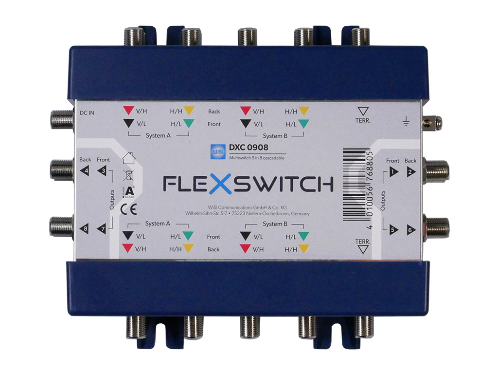 Der DXC 0908 ist ein Kaskaden-Multischalter mit 9 Eingängen zur Verteilung von 8 Satelliten Polarisationsebenen und terrestrischer Signale. Die Ebenen stehen an 9 Kaskadenausgängen für nachfolgende Multischalter zur Verfügung. An den 8 Teilnehmerausgängen können handelsübliche DVB-S/S2 Receiver oder TV-Geräte mit integriertem Empfänger betrieben werden. Eingespeiste terrestrische Signale wie DVB-T/T2, DAB oder UKW stehen ebenfalls an jedem Teilnehmerausgang zur Verfügung. Der DXC 0908 überzeugt mit einer niedrigen Anschlussdämpfung die durch den aktiven terrestrischen und SAT- Zweig realisiert wird. Die LNB- Spannungsversorgung wird über die Stammleitungen oder über die optional erhältlichen externen Netzteilen DXP 1812 oder DXP 1830 sichergestellt.