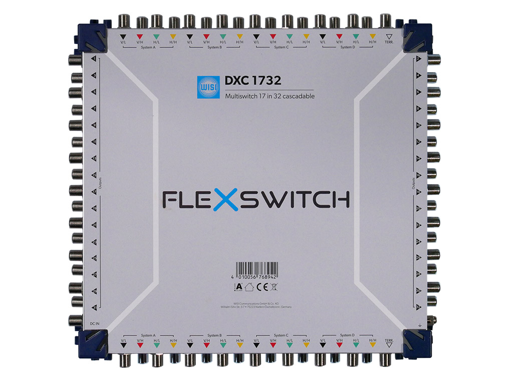 Der DXC 1732 ist ein Kaskaden-Multischalter mit 17 Eingängen zur Verteilung von 16 Satelliten Polarisationsebenen und terrestrischer Signale. Die Ebenen stehen an 13 Kaskadenausgängen für nachfolgende Multischalter zur Verfügung. An den 32 Teilnehmerausgängen können handelsübliche DVB-S/S2 Receiver oder TV-Geräte mit integriertem Empfänger betrieben werden. Eingespeiste terrestrische Signale wie DVB-T/T2, DAB oder UKW stehen ebenfalls an jedem Teilnehmerausgang zur Verfügung. Der DXC 1732 überzeugt mit einer niedrigen Anschlussdämpfung die durch den aktiven SAT- Zweig realisiert wird. Über den passiven terrestrischen Zweig können Multimediale-Dienste wie „LAN over Coax“ oder Signale von Gemeinschaftsanlagen eingespeist werden. Die LNB- Spannungsversorgung wird über die Stammleitungen oder über die optional erhältlichen externen Netzteilen DXP 1812 oder DXP 1830 sichergestellt.