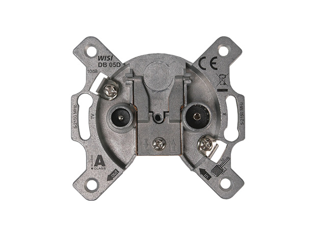 Universal 2-Loch Durchgangsdose mit breitbandigem Frequenzbereich von 5…2150 MHz. Somit kann die DB 05D Antennendose sowohl in BK-Applikationen inklusive Rückkanal als auch bei SAT- Einkabellösungen ohne Schaltspannungen genutzt werden. Zum Anschluss der Endgeräte stehen 2 IEC-Anschlüsse zur Verfügung. Die hohe Entkopplung der Teilnehmerausgänge stellt den einwandfreien Betrieb der angeschlossenen Endgeräte sicher. Das Schirmungsmaß der Klasse A wird erreicht.
