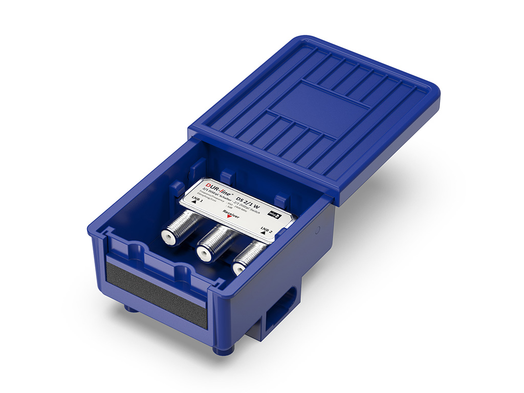 DiSEqC 2.0 Relais 2/1 mit Wetterschutzgehäuse für 2 Satelliten und 1 Teilnehmer.
